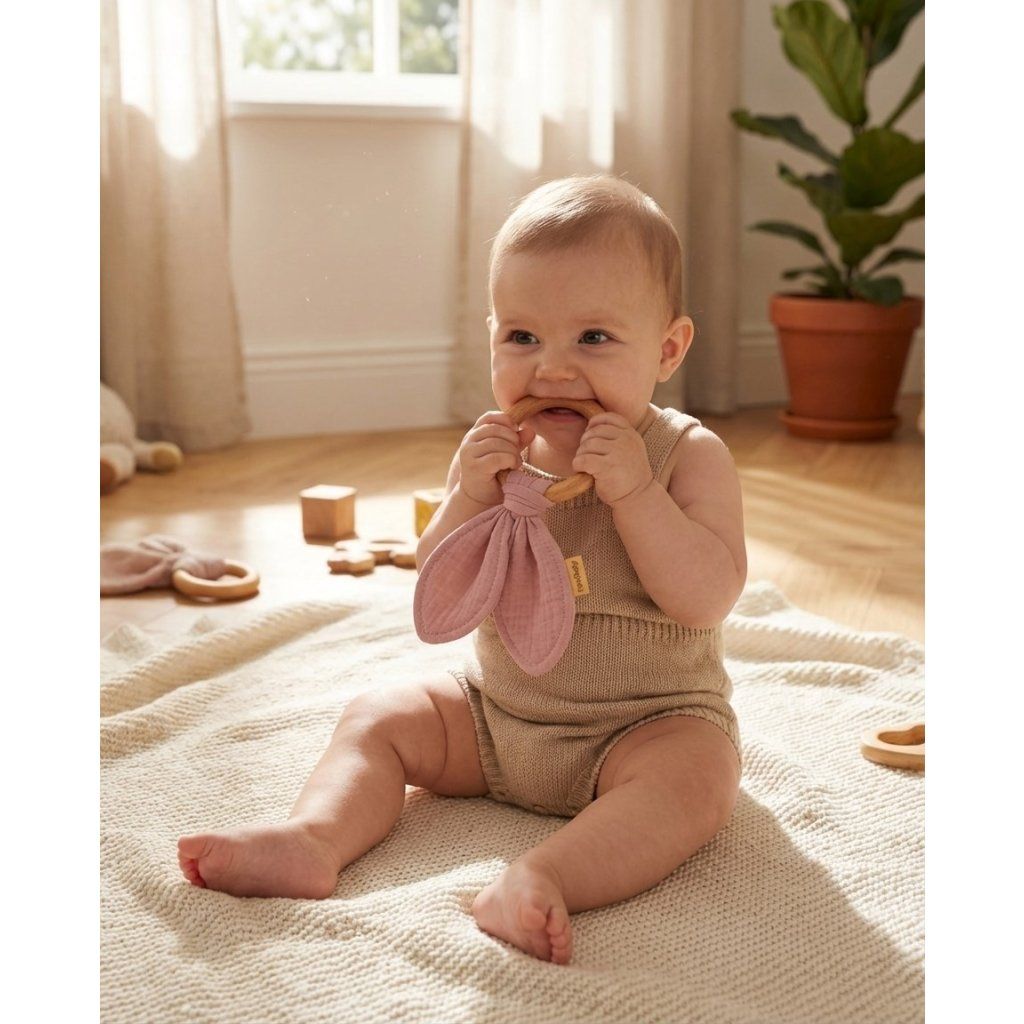Hryzátko s mušelínovou plienkou je ideálna súprava, keď sa dieťaťu prerezávajú zúbky. Hryzátko je vyrobené z bukového dreva šetrného k životnému prostrediu a mäkkej mušelínovej tkaniny. Je úplne bezpečná pre bábätká a prináša upokojujúcu úľavu pri prerezávaní zúbkov. Hryzátko možno použiť aj ako hračku pre bábätká. Hryzátko sa dokonale hodí k našim ostatným mušelínovým výrobkom a vytvára krásnu súpravu, ktorú môžete darovať ako darček na oslavu narodenia dieťaťa.