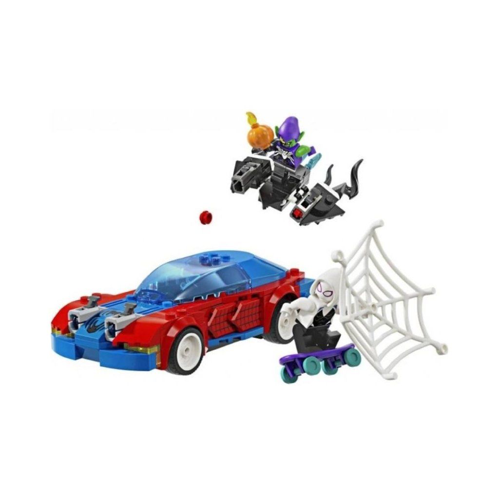 Spider-Man, Ghost-Spider a Zjedený Green Goblin sa zapájajú do rýchlej akcie s úžasnými vozidlami, zbraňami a doplnkami. Spider-Manovo auto má dva vystreľovače namontované vpredu, vetroň Green Goblina má dva vystreľovače a tekvicové bomby a Ghost-Spider jazdí na skateboarde s ručnými vystreľovačmi pavučín. Spider-Man sa hojdá na elastickej „kravate“ a používa veľkú pavučinu na chytanie zloduchov. Odnímateľné časti umožňujú prístup do interiéru auta, ktorý je dostatočne veľký na to, aby sa doň zmestili dve minifigúrky a skateboard. Rozmer (cm)