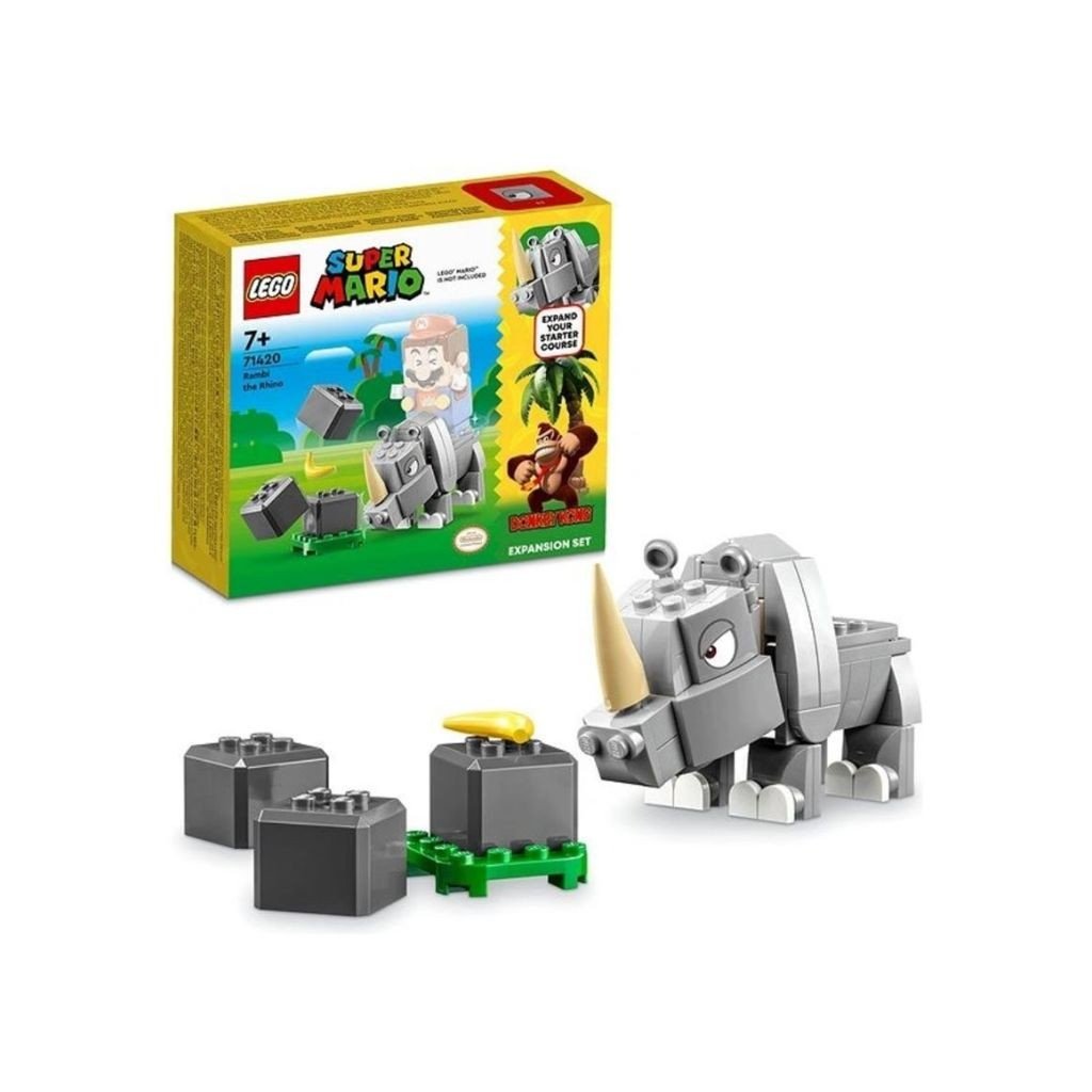 Pripravte sa na poriadne LEGO® Super Mario™ dobrodružstvá s rozširujúcim setom Nosorožec Rambi 71420 pre deti od 7 rokov. Balenie obsahuje postavičku Rambiho z kociek LEGO, na ktorej môžu jazdiť interaktívne figúrky LEGO® Mario™, LEGO® Luigi™ alebo LEGO® Peach™ nie sú súčasťou balenia. Počas Rambiho chôdze a popri nabíjaní v priložených skalných prvkoch naskladaných na sebe a ďalších pohyboch sa v interaktívnej figúrke aktivujú zvukové efekty. Poznámka: na interaktívnu hru je potrebný štartovací set 71360, 71387 alebo 71403. Rozmer (cm)