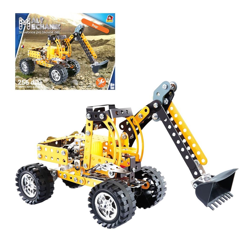 Malý mechanik - báger. Detská stavebnica Malý mechanik obsahuje kovové diely a plastové doplnky, spája sa pomocou skrutky a matičiek. 256 dielikov. Český box v grafickom dizajne radu Malý mechanik.