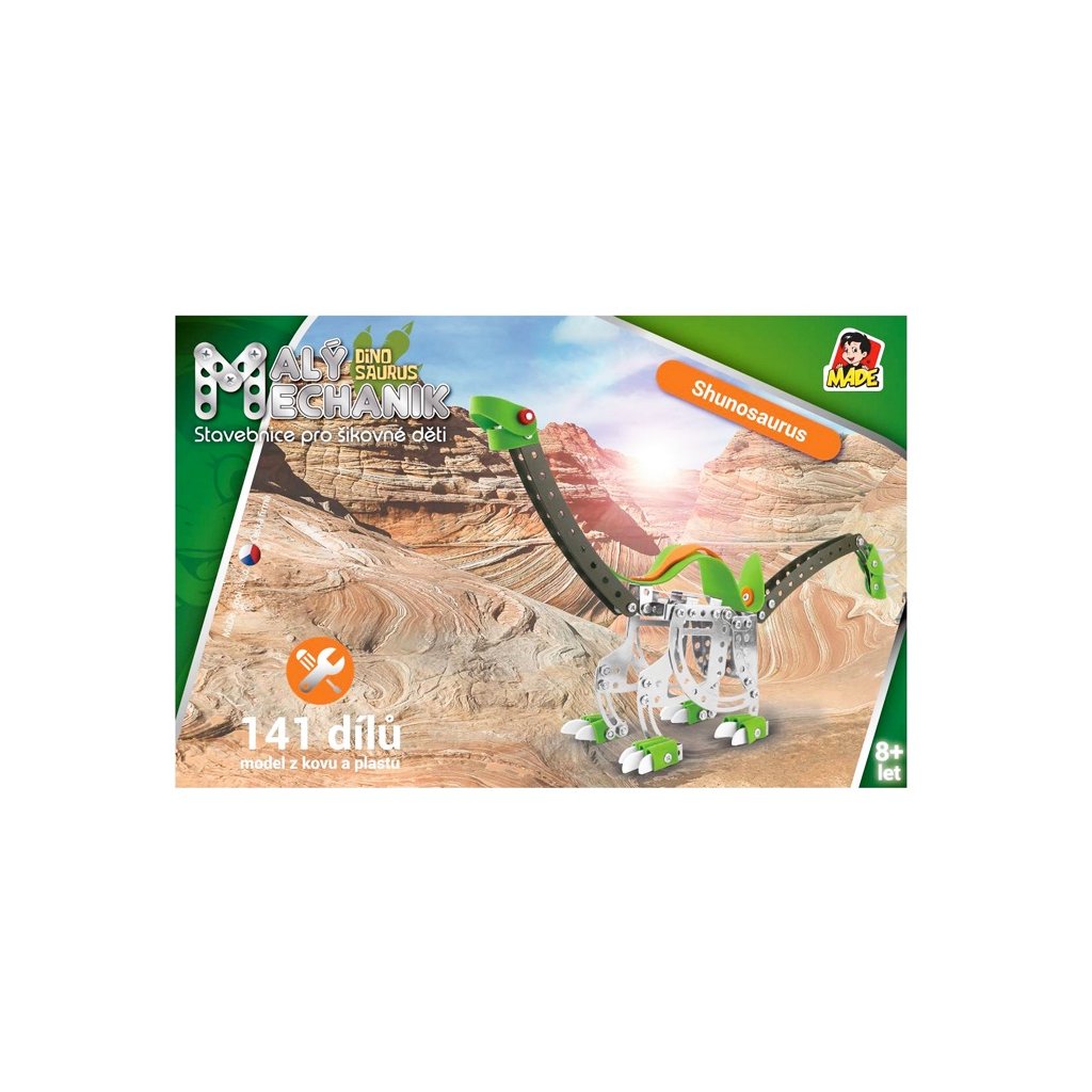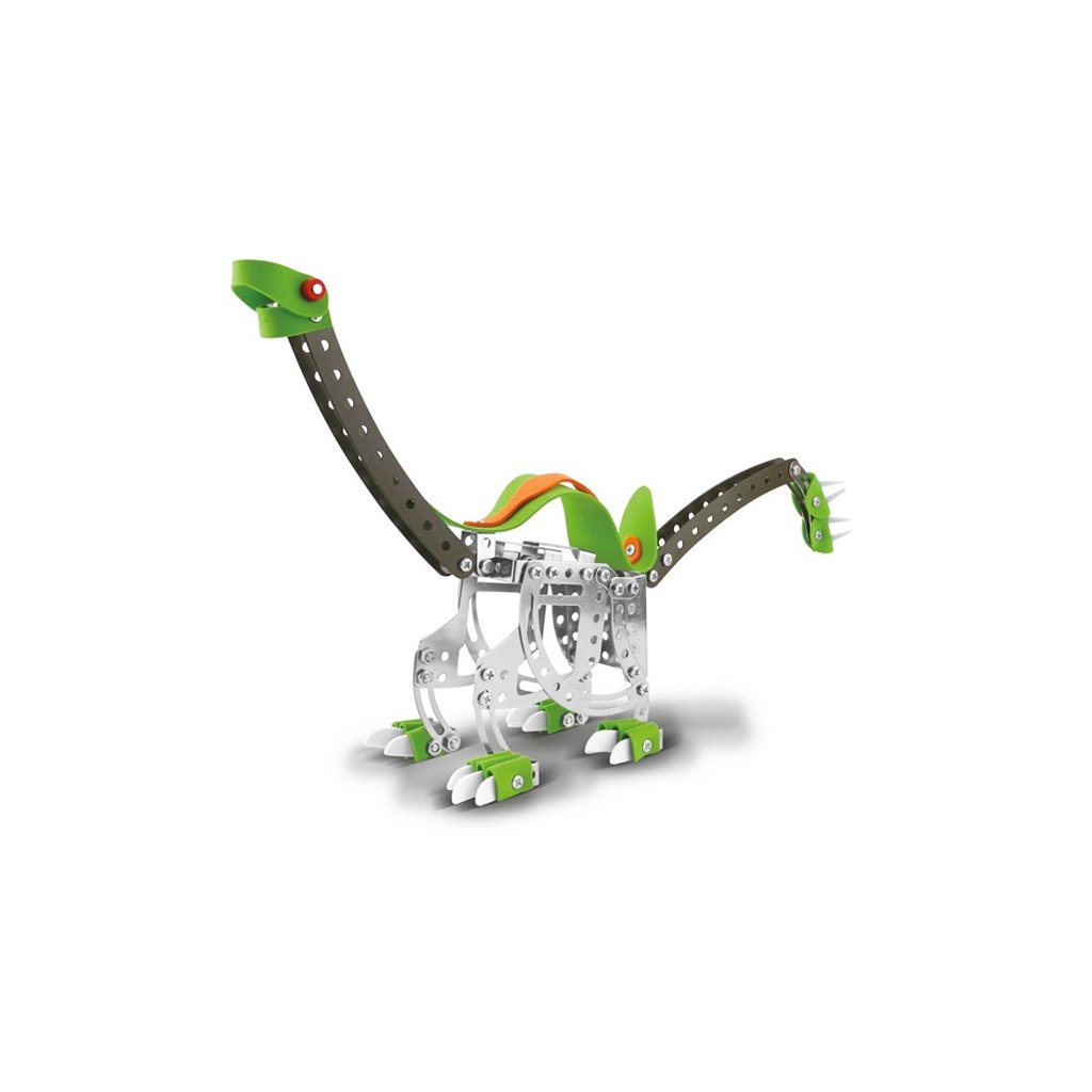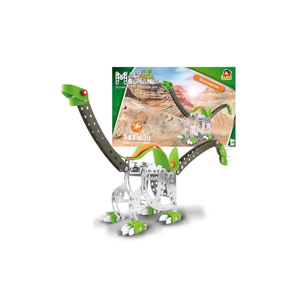 Malý mechanik - apatosaurus. Detská stavebnica Malý mechanik obsahuje kovové diely a plastové doplnky, spája pomocou šróbikov a matiček. 141 dielkov. Český box v grafickom dizajne rady Malý mechanik.