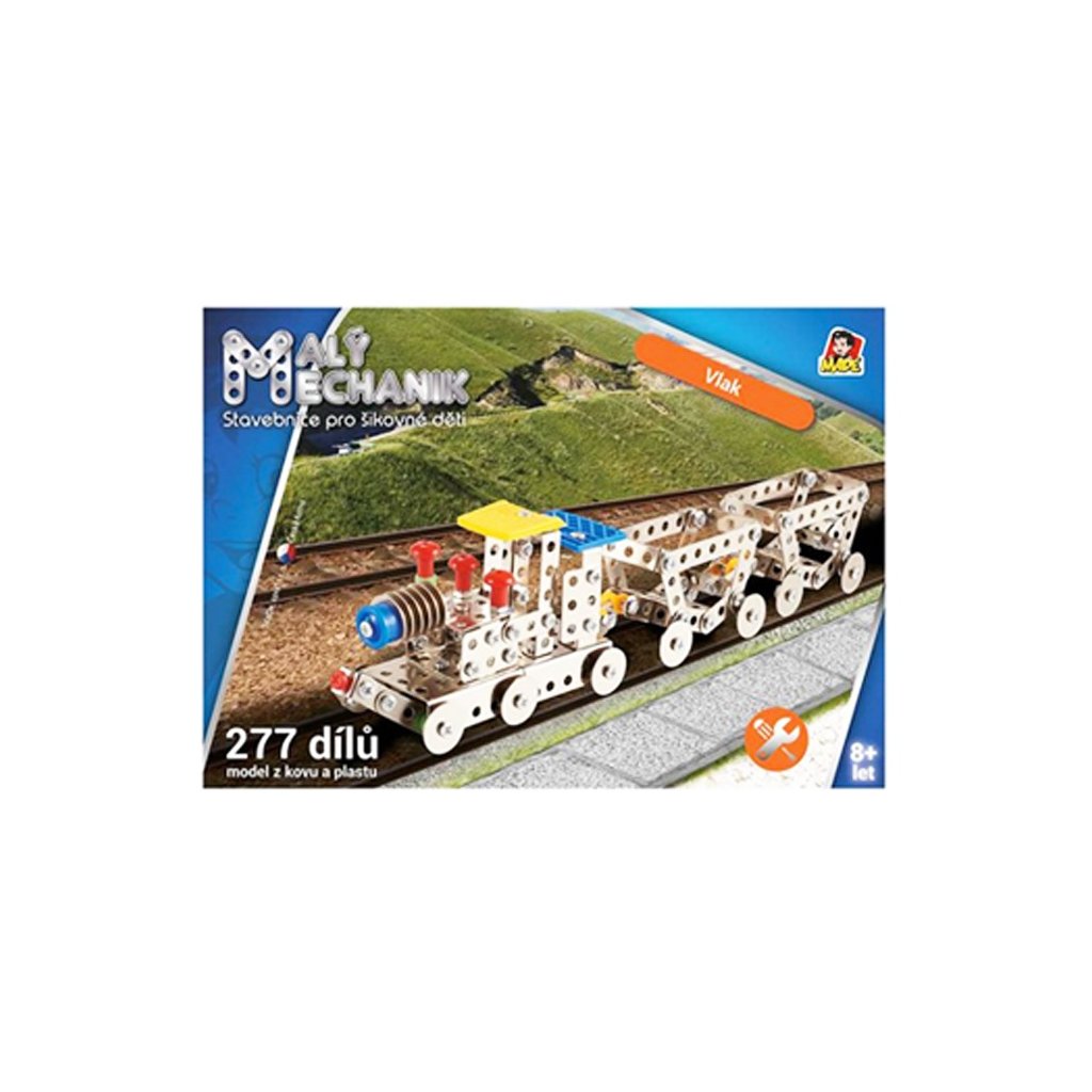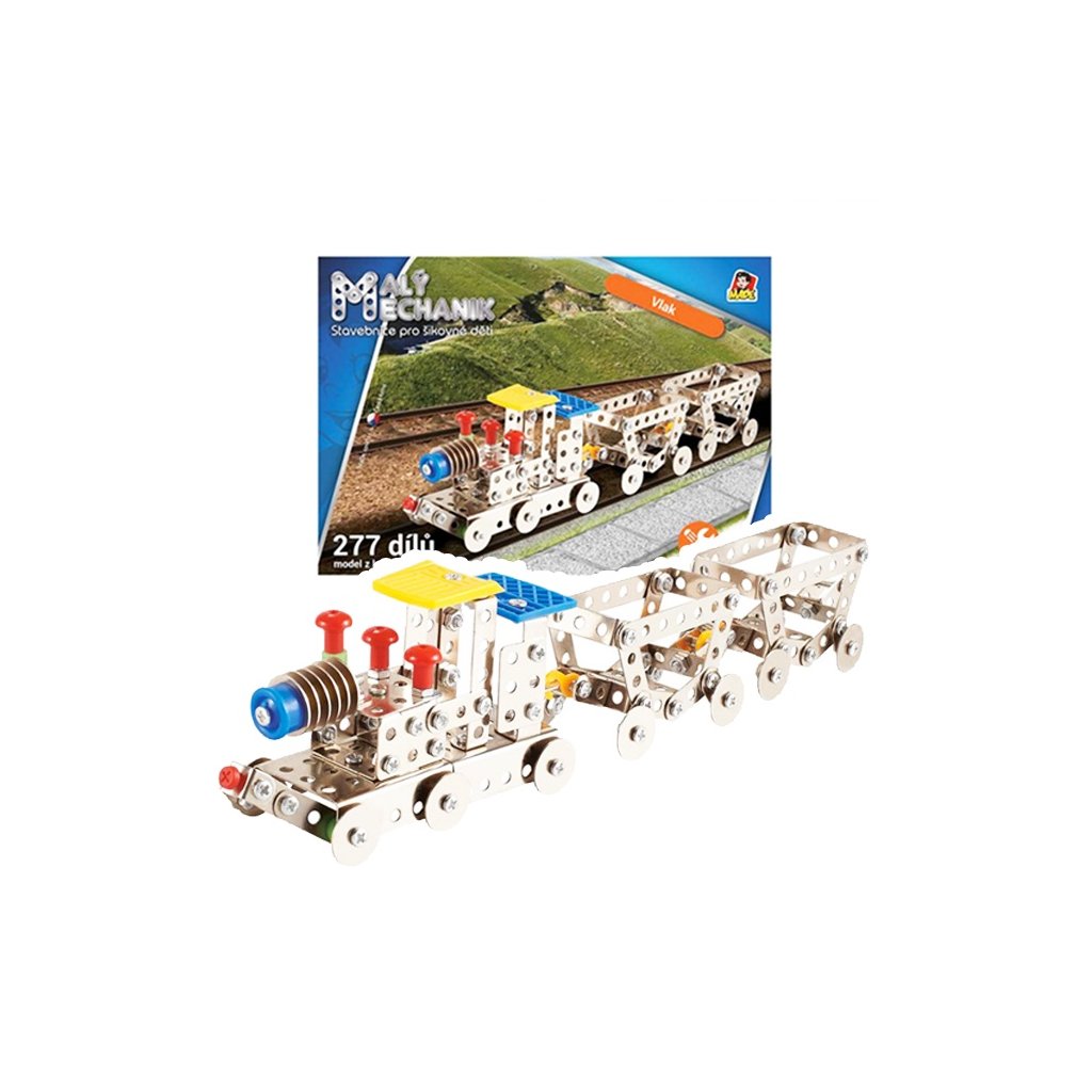 Malý mechanik - vlaková súprava. Detská stavebnica Malý mechanik obsahuje kovové diely a plastové doplnky, spája sa pomocou skrutiek a matičiek. 277 dielikov. Stavebnice sú ideálnou voľbou pre všetky deti, rozvíja logické myslenie, jemnú motoriku, sústredenosť a učia trpezlivosti a pritom sú skvelou zábavou.