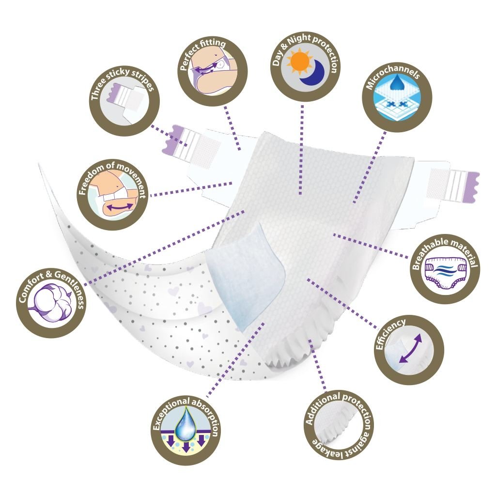 - 3D suchý zips, vďaka ktorému sa plienka dokonale prispôsobí tvaru bruška