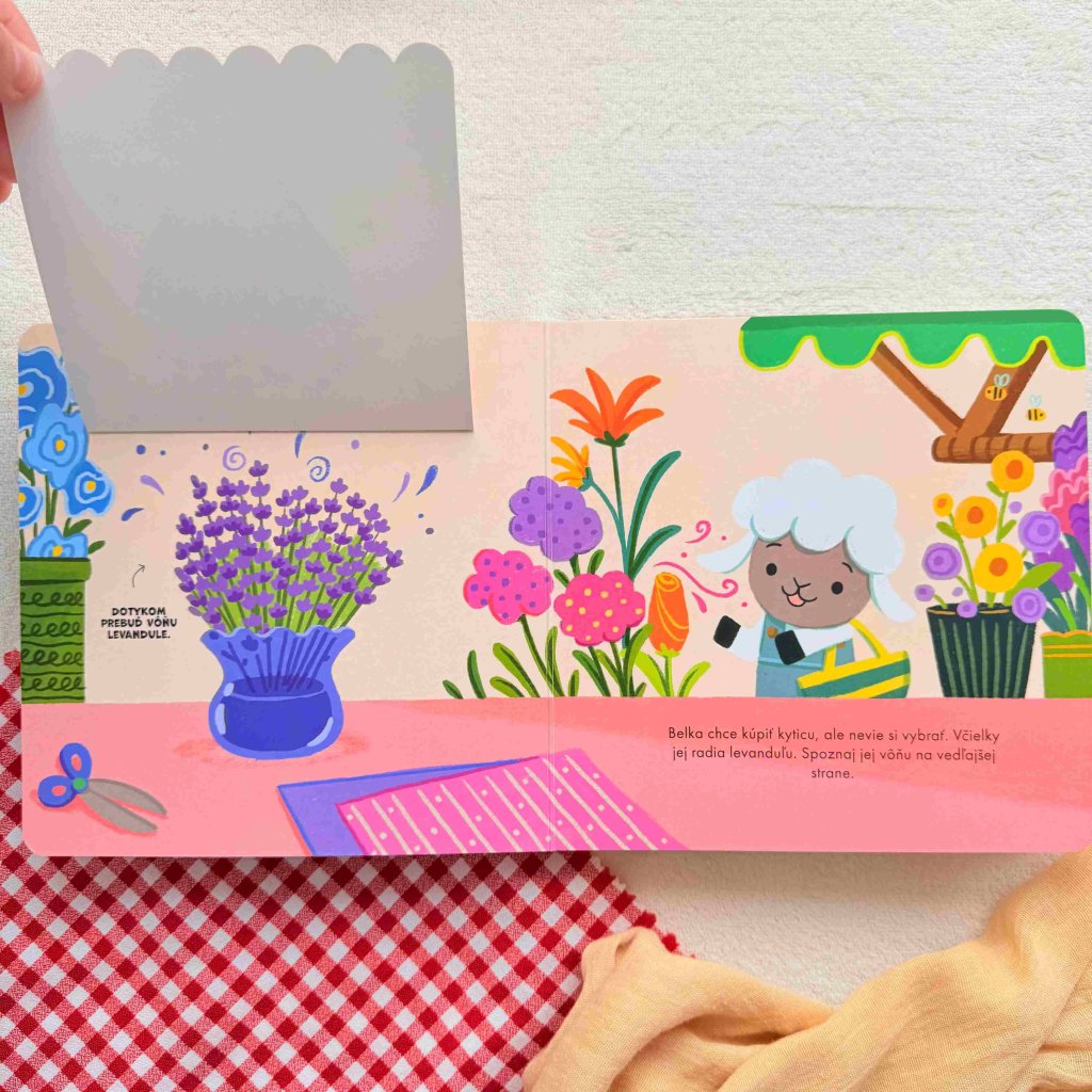 Ovečka Belka sa vybrala na nákup na farmársky trh, kde to hýri farbami a krásne rozvoniava! Každá dvojstrana obsahuje realistickú vôňu ovocia alebo zeleniny – stačí sa jemne dotknúť ...