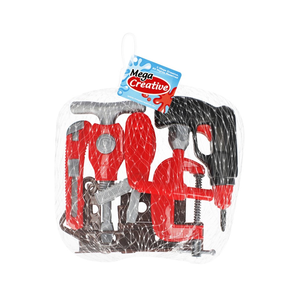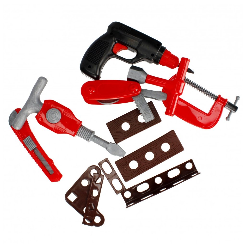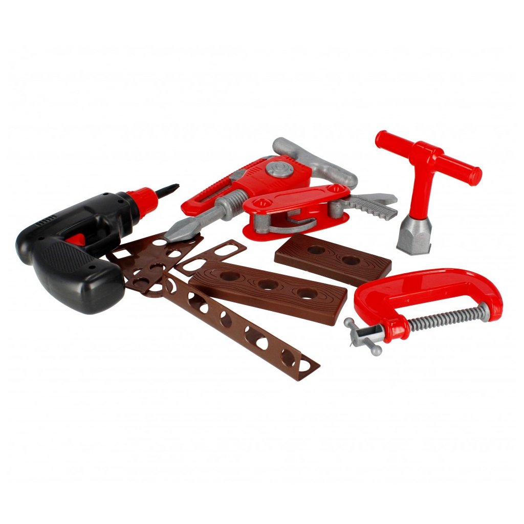 Náradie červené sada, obsah sady je vŕtačka, nôž na tapety, zverák, vŕtací skrutkovací nástavec, 2x doska, 4x štvorec, viacúčelový kľúč, pneumatické kladivo. Cena je za 1 sadu. Má rozmer 10X27 cm. Vhodné pre deti vo veku 3+. Rozmer (cm)