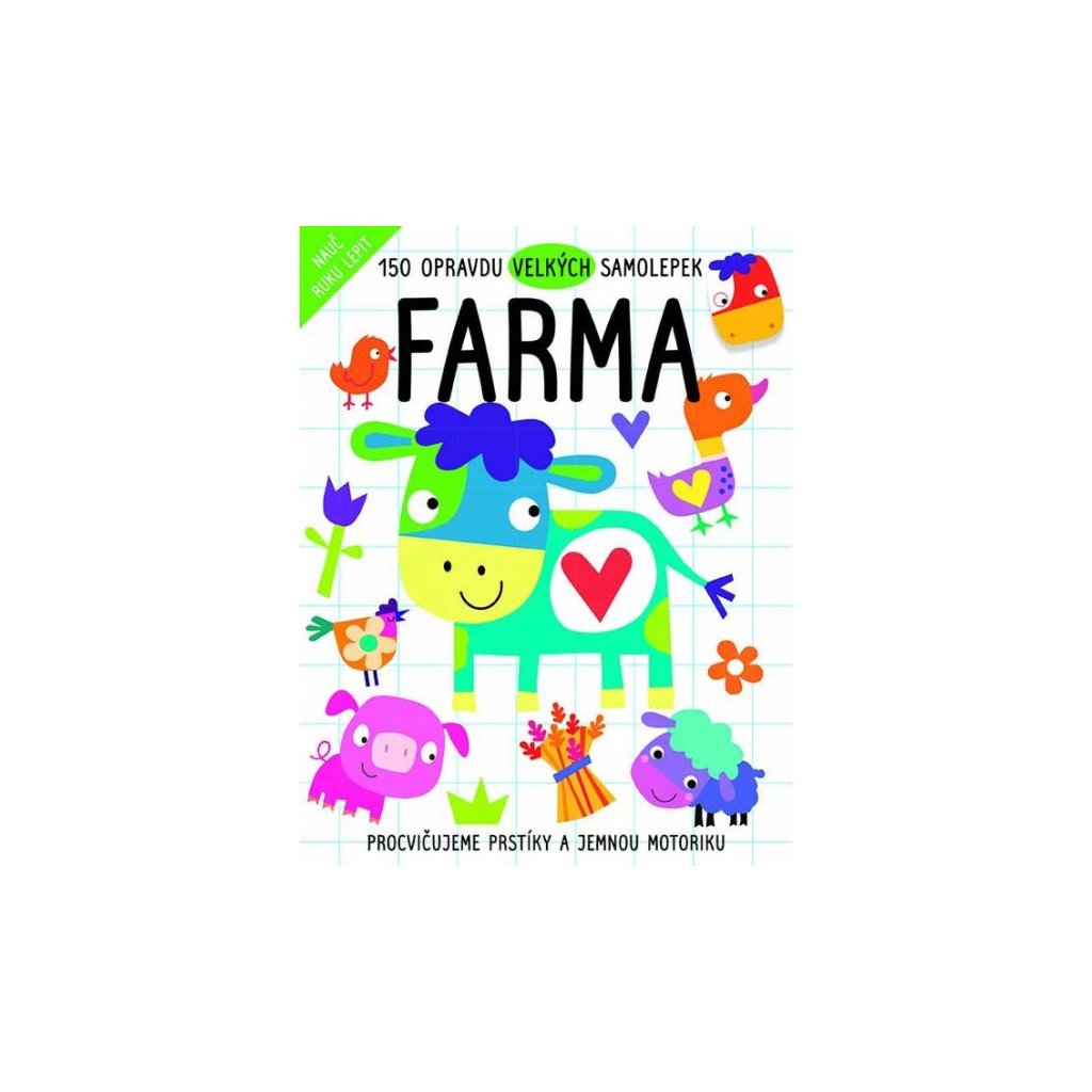 Nauč ruku lepiť-Farma. Titul obsahuje 24 strán plných veselých obrázkov a 150 veľkých samolepiek. Rozmery sú 21 x 28 cm. Rozmer (cm)