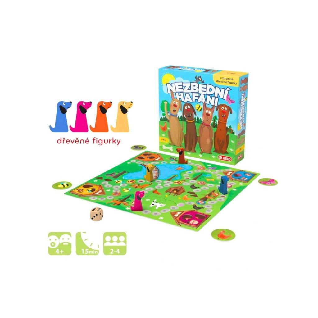 Jednoduchá a zábavná stolová hra pre deti s roztomilými drevenými figúrkami psíkov. Psie maminky sa snažia dostať svoje šteniatka späť do búdky, kým príde čas obeda. Hra rozvíja jemnú motoriku, trpezlivosť a sústredenie. Obsahuje herný plán, 4 drevené figúrky, 12 žetónov, 4 búdky a hraciu kocku. Vhodné pre deti od 4 rokov. Rozmer (cm)
