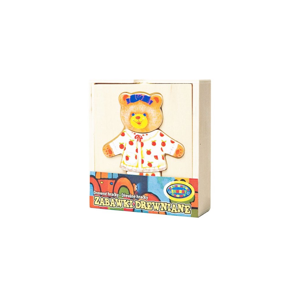 Obleč macíka. V praktickej drevenej krabičke sú rôzne drevené oblečenia na vkladanie....