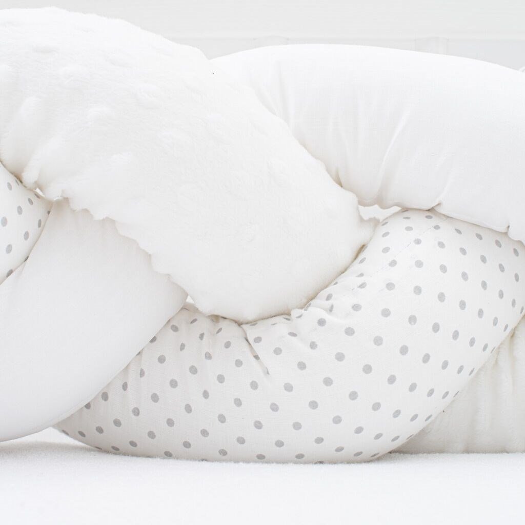 Hebučký a praktický pletený vrkoč New Baby je modernou alternatívou tradičného alebo vankúšového mantinelu nielen do detskej postieľky. Všetky tri pramene sú vyrobené z veľmi kvalitného bavlneného materiálu a antialergickej polyesterovej výplne a ručne spletených do vrkoča. Môžete ho použiť v postieľke, kolíske, kde chráni dieťa pred tvrdými priečkami postieľky a izoluje od studenej steny. Mantinel sa prispôsobí každej postieľke a pomocou troch priložených stúh ho ľahko upevníte. Staršie dieťa ho môže využívať pre zábavu alebo ako originálnu dekoráciu detskej izby.