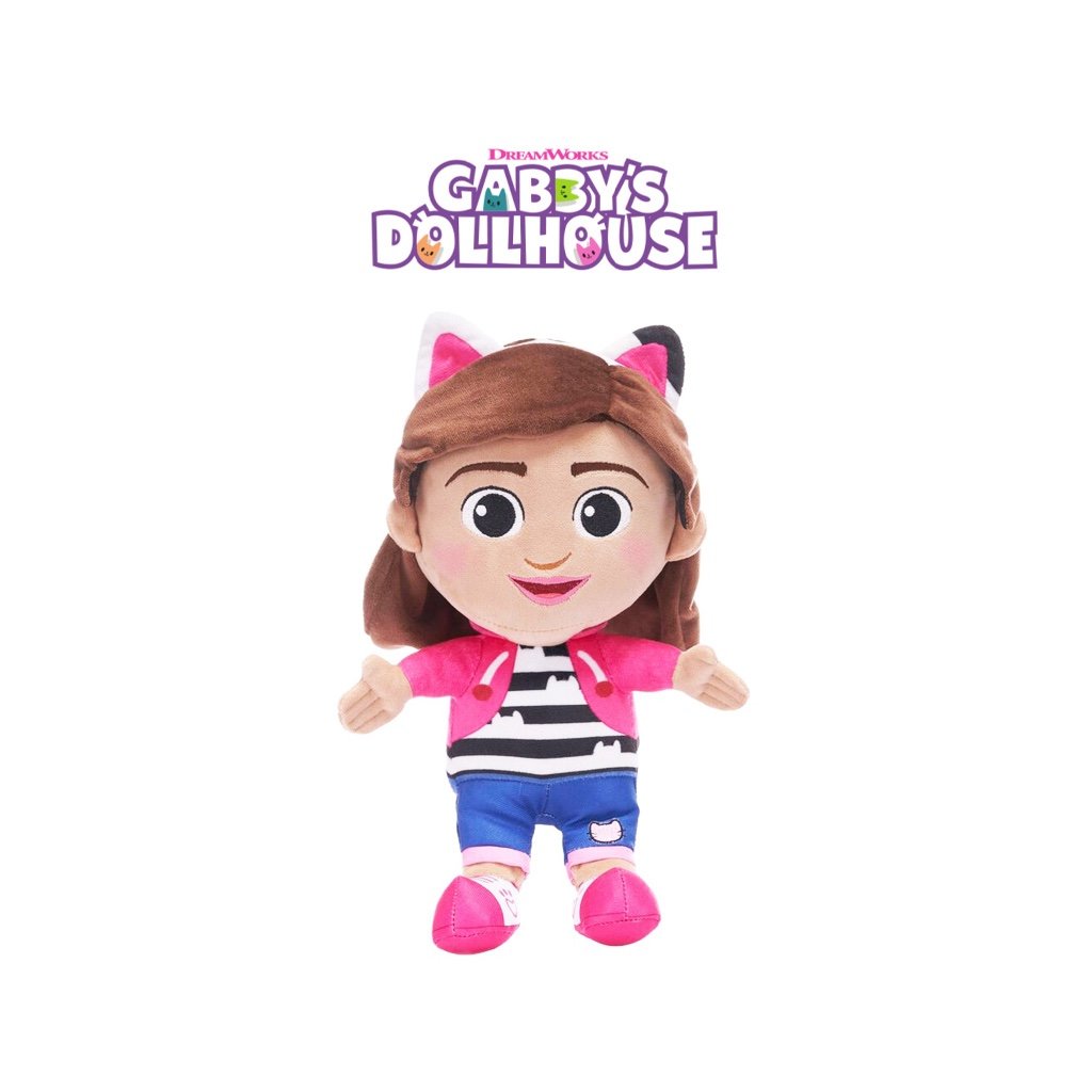 Plyšová Gabby - Gabbys Dollhouse. Toto je plyšová hračka predstavujúca Gabby z Gabbys Dollhouse. Má jej charakteristickú čelenku s mačacími ušami, hnedé vlasy, pruhované tričko, ružovú bundu a modré rifle. Plyšová hračka má veľké, priateľské oči a vrúcny úsmev. Jej hlavná komerčná hodnota spočíva v silnej popularite detského seriálu Gabbys Dollhouse, vďaka čomu je veľmi žiadanou hračkou pre mladých fanúšikov tohto seriálu. Rozmer (cm)
