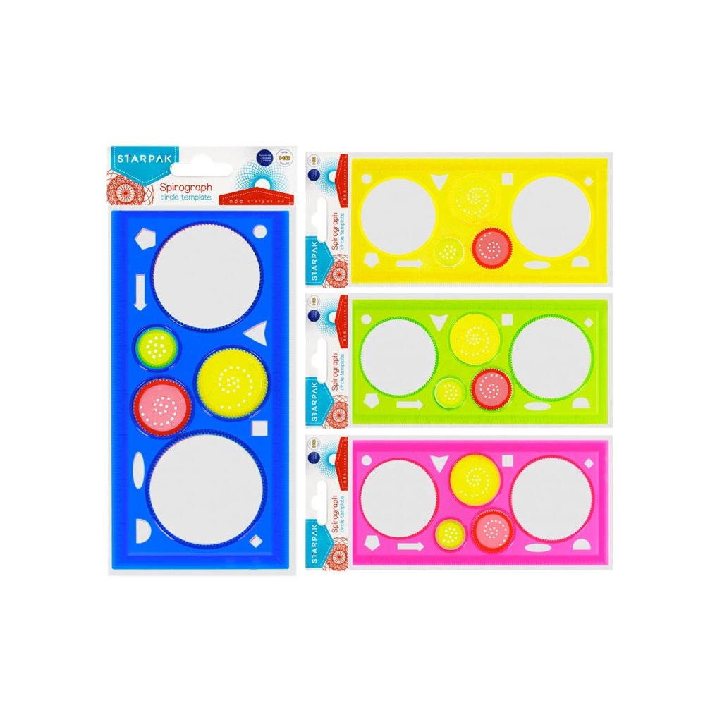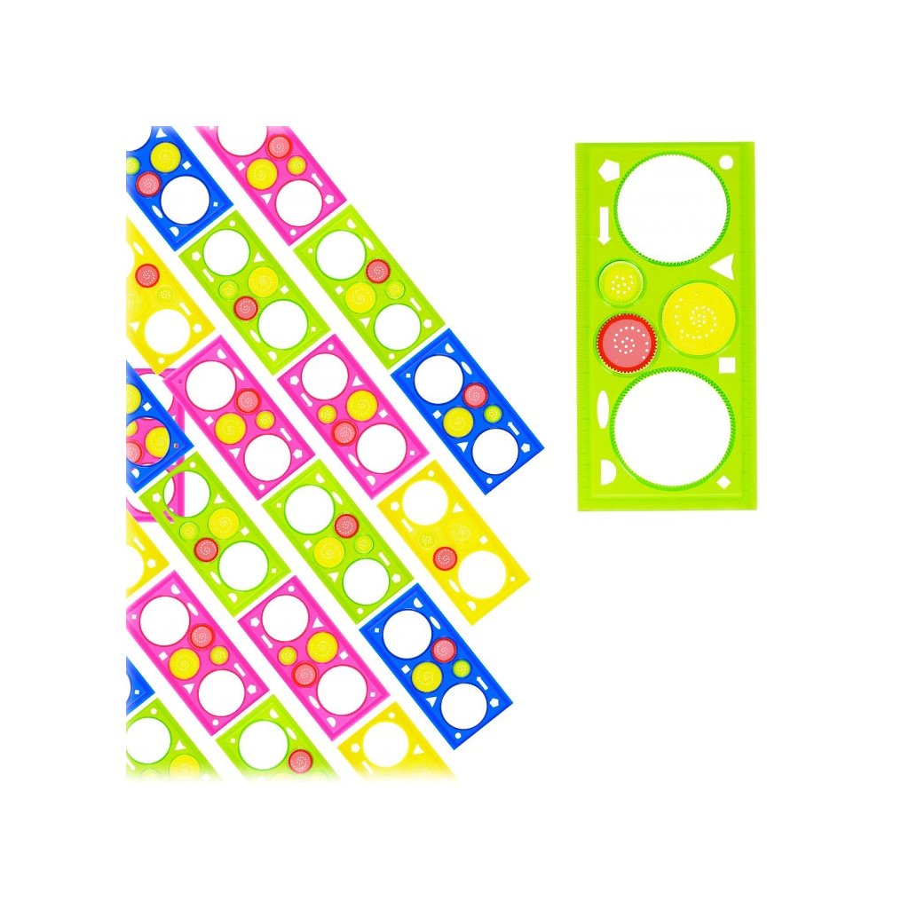 Šablóna s rôznymi veľkosťami koliesok a kruhov. Šablóna umožňuje deťom kresliť presné tvary a potom sa zabaviť, napríklad vyfarbovať. Vyrobené z odolného priehľadného plastu. Je dostupný v štyroch farebných variantoch: ružová, zelená, modrá, žltá. Určené pre deti vo veku 3+. Rozmery balenia 25x12