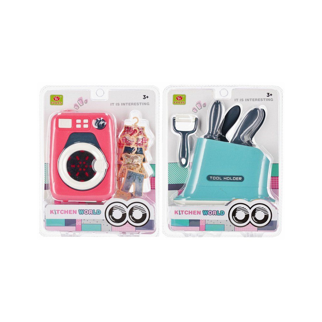 Sada spotrebičov do domácnosti s doplnkami, sada má rozmery 16X22X5 cm. Na výber z dvoch variánt Sada s práčkou alebo Sada s nožmi. Obsah prvej sady je práčka, domáce spotrebiče, 5x vešiak s oblečením. Obsah druhej je kuchynské nože, stojan škrabka. Cena je za 1 sadu. Vhodné pre deti 3+. Rozmer (cm)
