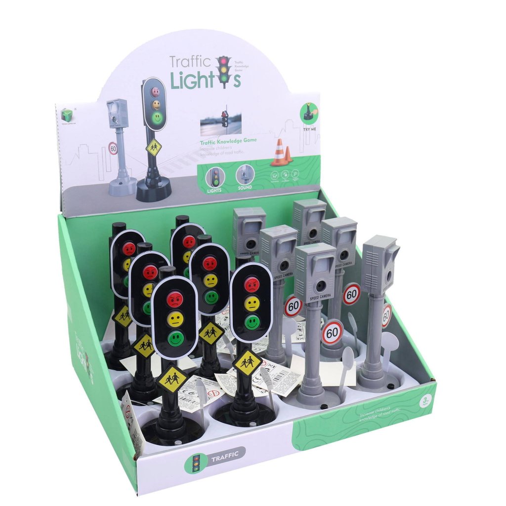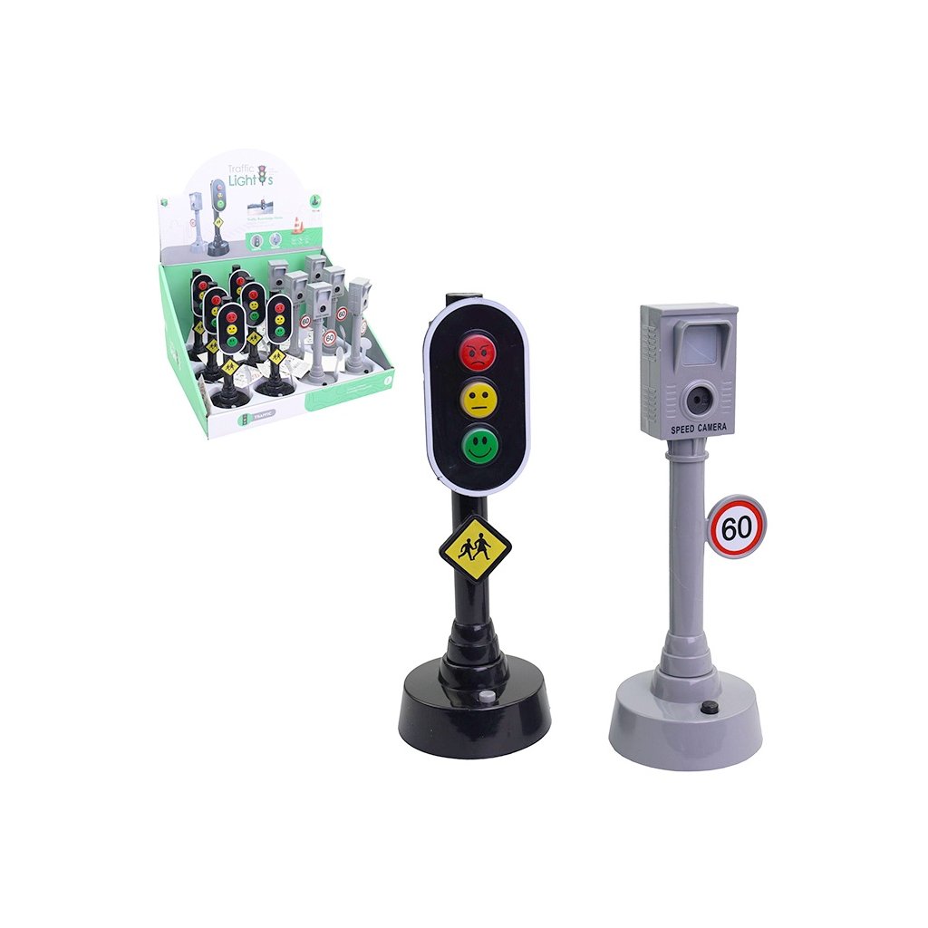 Semafory sú čierne a na ich malých svetielkach sú namaľované minifigúrky, ktoré symbolizujú možnosti prechodu cez priechod pre chodcov. Stlačením tlačidla sa svetlo zapne. Rýchlostný fotoaparát s nápisom 60km rýchlostný limit, je sivej farby a má svetelné a zvukové efekty, ktoré napodobňujú skutočné snímanie. Hračka je skvelou pomôckou na výučbu a oboznamovanie detí s pravidlami bezpečnosti cestnej premávky. Rozmer semaforu, fotoradaru je 15cm. Určené pre deti vo veku 3+. Rozmer (cm)