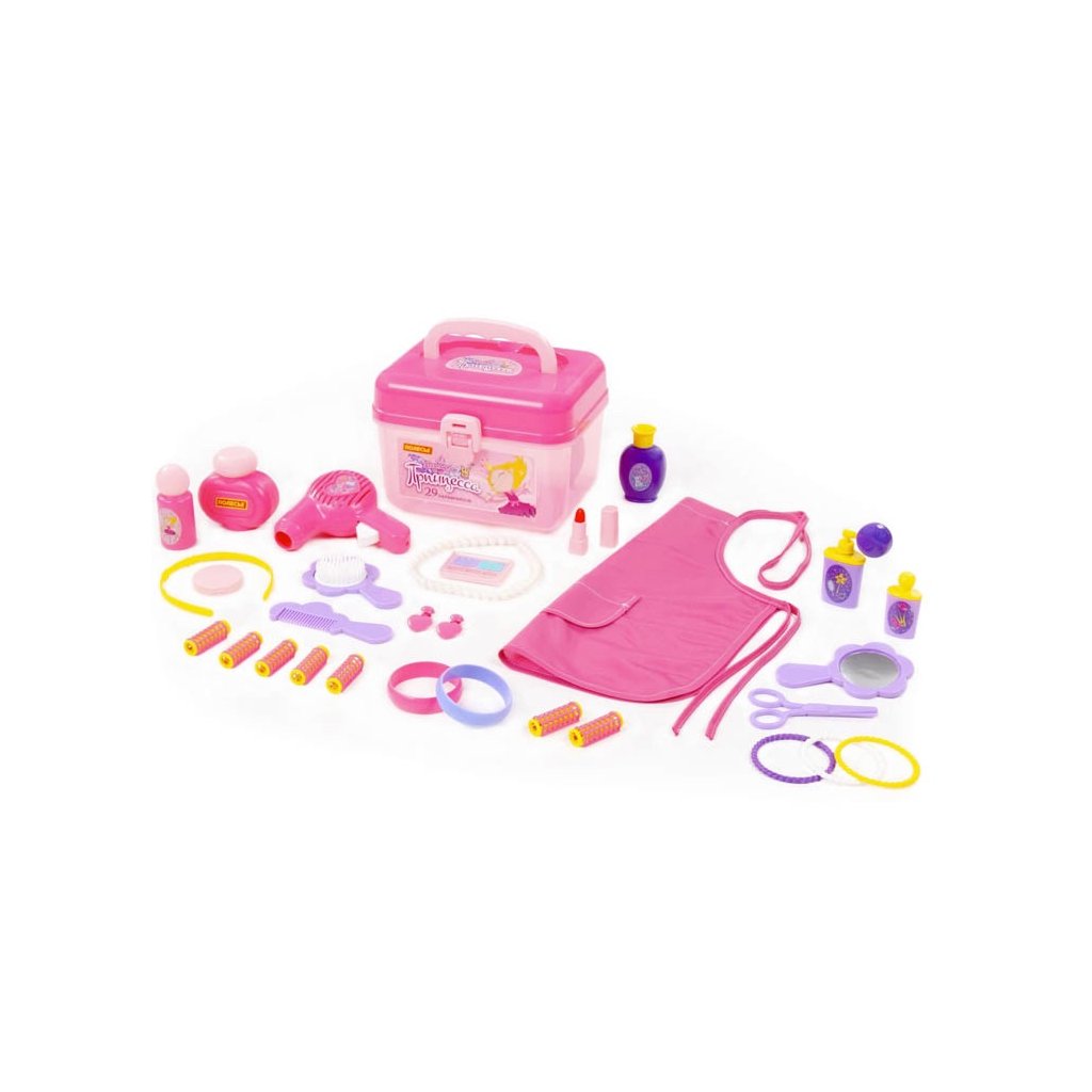 zrkadlo - 1 ks, sušič vlasov - 1 ks, krabička na prášok - 1 ks, očné tiene - 1 ks, rúž - 1 ks, fľaštičky na kozmetiku - 4 ks., imitácia parfumu - 1 ks, nožnice - 1 ks, zástera - 1 ks. Súprava je zabalená v kufríku, kam si mladá parádnica odloží ďalšie vlasové doplnky. Hra rozvíja u dievčat estetický vkus, učí ich sledovať svoj vzhľad a účes. So súpravou Malá princezná si môžu dievčatá zorganizovať svoj vlastný kozmetický salón alebo kaderníctvo a rozvíjať tak svoju predstavivosť a fantáziu. Rozmer (cm)