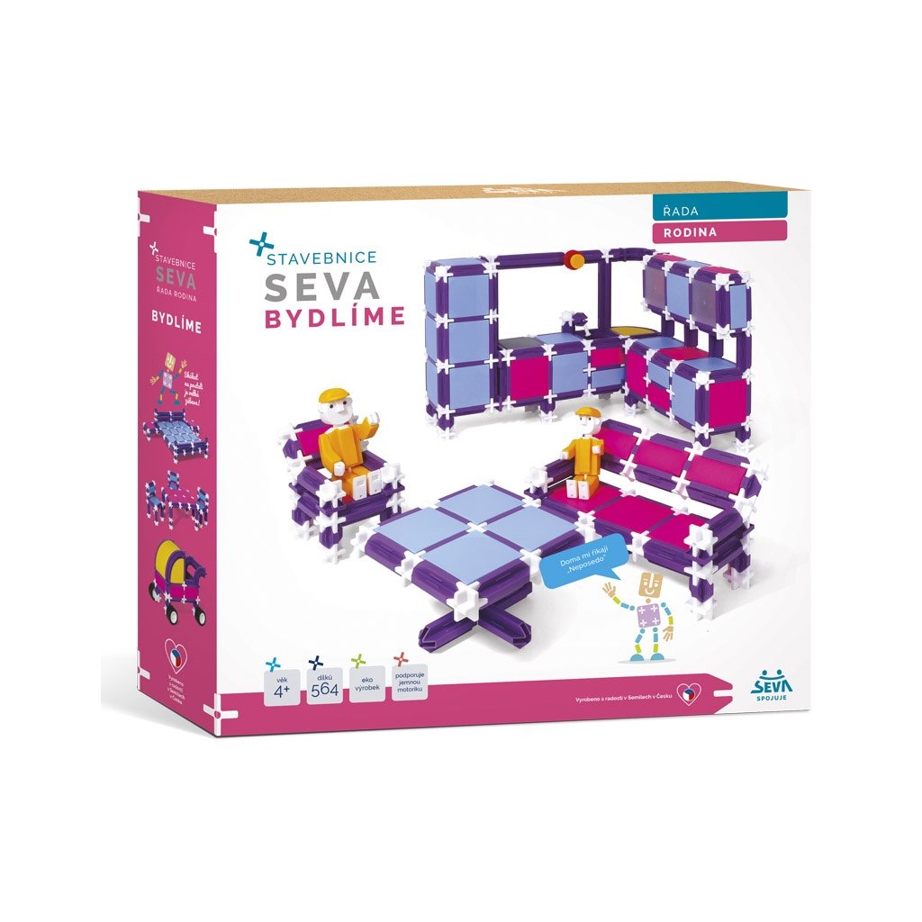 Stavebnice SEVA RODINA - Bývame obsahuje 564 dielikov, z ktorých si môžete zostaviť napr. Kuchyňu, spálňu, obývacia izba, kočík, panáčikov Seváčky, atď.