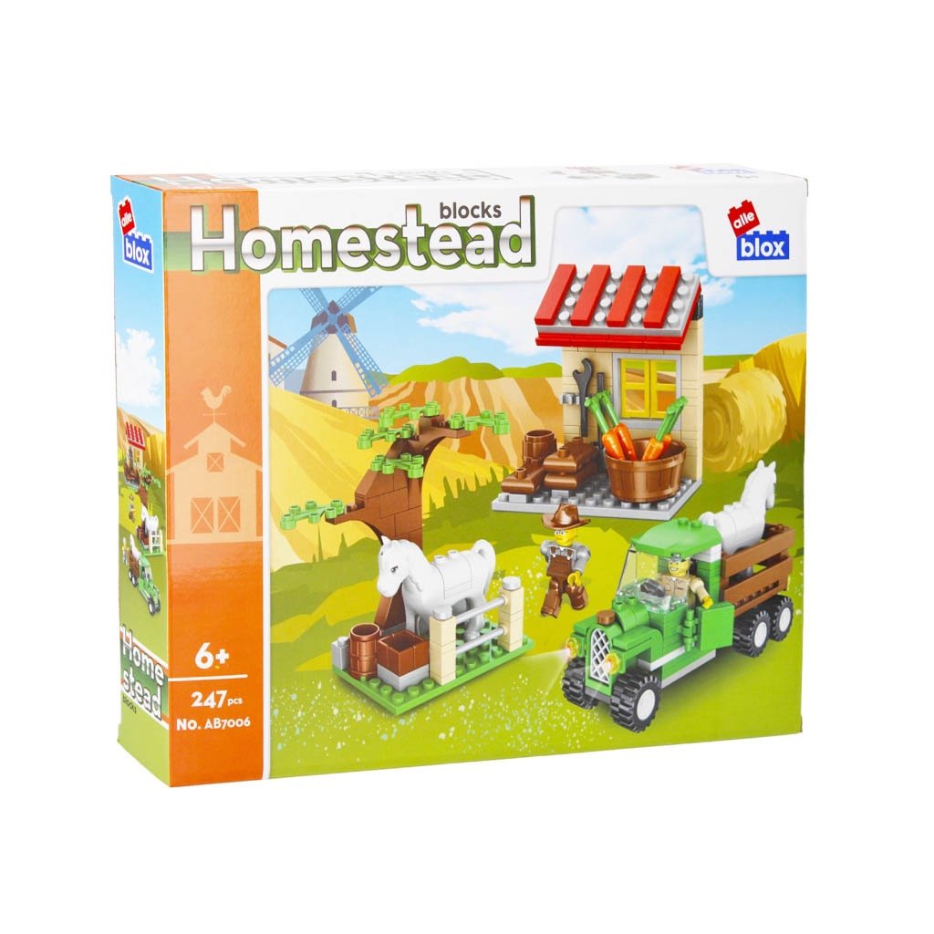 Koňská farma s príslušenstvom Stavebnica, má rozmery traktor-14x7x4, farma-8x8x5, strom-8x11x5. Cena je za balenie, ktorý obsahuje 247 tehlových prvkov na zostavenie a montážny návod. Vhodné pre deti 6+. Rozmer (cm)