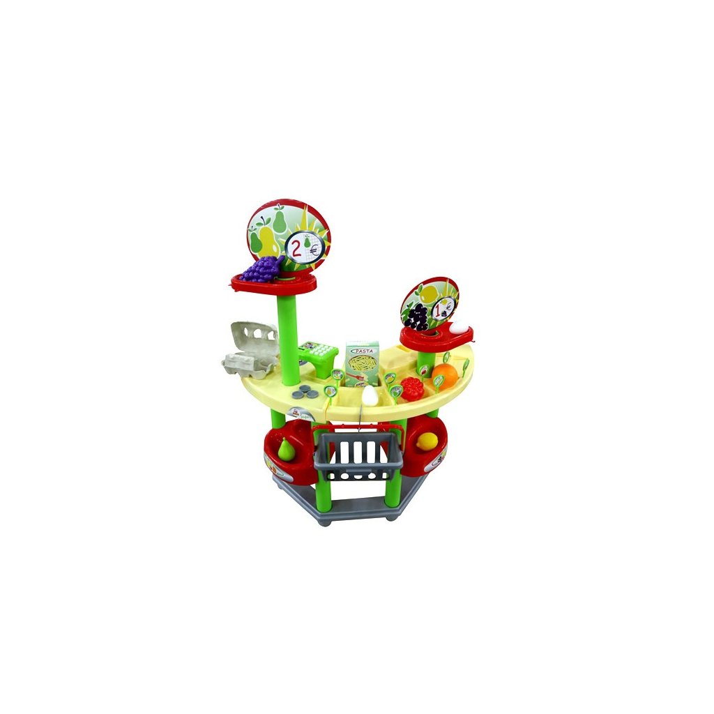 Pult Supermarket je balený v krabici 50 x 56 cm veľkej. Pult je 87 cm vysoký. Súčasťou balenia sú aj všetky vyobrazené doplnky, ovocie, cenovky kasa, košík, mince a pod. Pult bol vyrobený ...