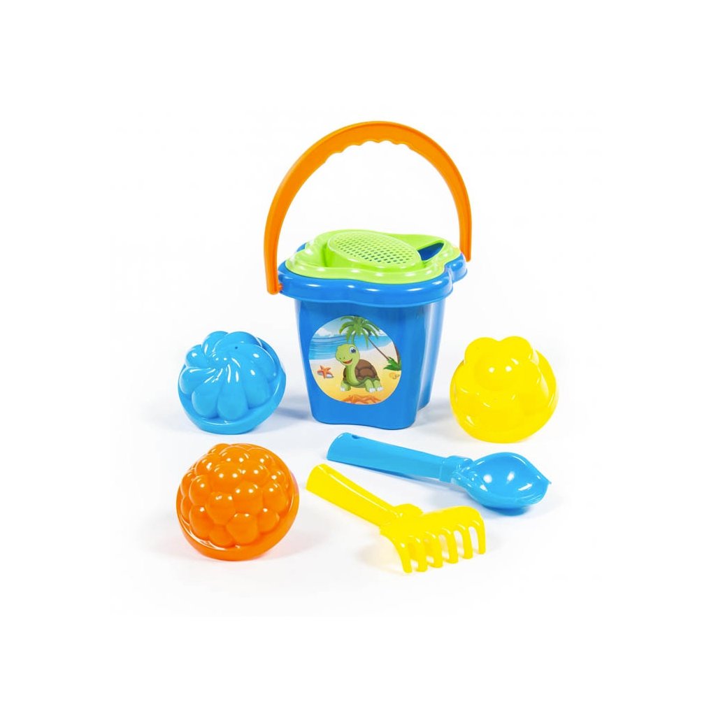 Súprava zo 7 častí, vedierko so sitkom s priemerom 14cm, lopatka, hrabličky a 3 formičky. Vyrobená v zelenej, fialovej a červenej farbe, k dispozícii podľa aktuálnej skladovej ponuky.
