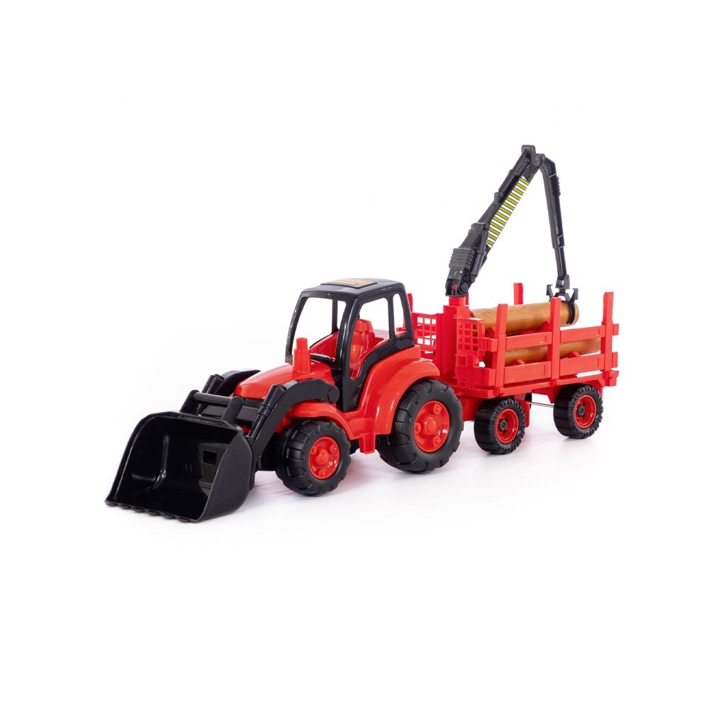 Plastový traktor s mechanicky pohyblivou radlicou, bez pohonu, S prívesom s nákladom dreva so žeriavom, vhodný na hru do interiéru aj na piesok, certifikovaný pre deti od 1 roku veku. Balenie v sieťke. Rozmer (cm)