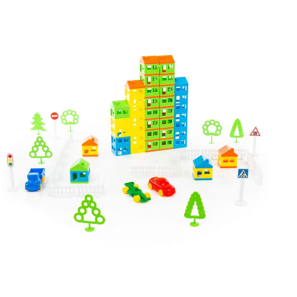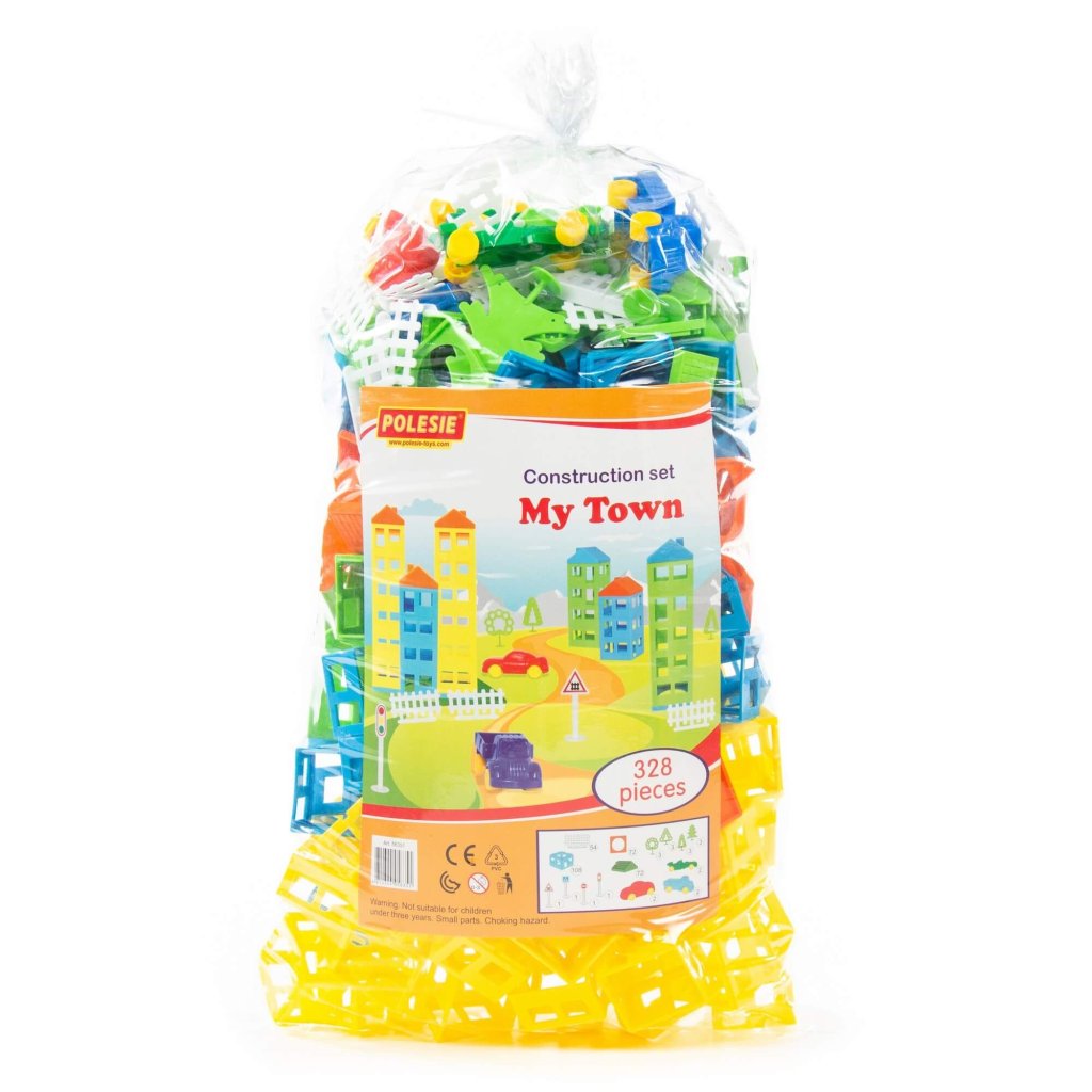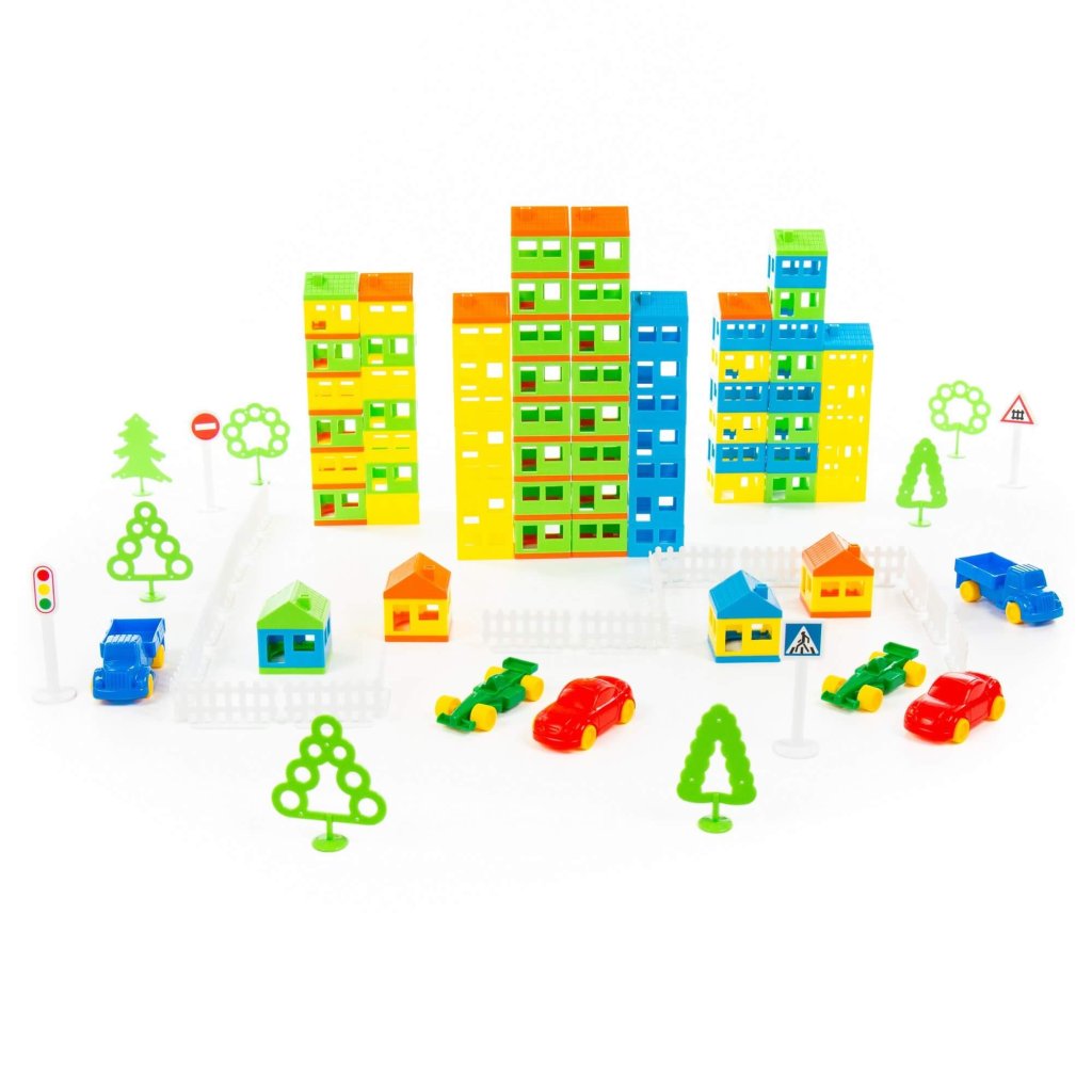 Stavebnica Moje mesto. V balení je 328 častí na postavenie mesta či dedinky. Základný diel je štvorec s oblokmi a dverami so stranou 5 cm a výškou 3 cm. Z týchto 108 častí a 72 strešnými časťami postavíme mesto, spolu s 54 časťami plota, 12 stromami, 6 autami a 4 dopravnými značkami. Hračka podporuje rozvoj jemnej motoriky, rozvoj základných stavebno technických zručností a návykov ako aj kreativity. Rozmer (cm)