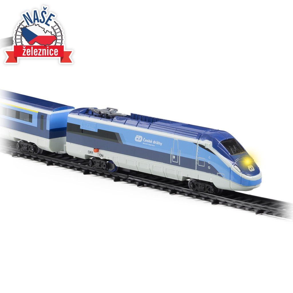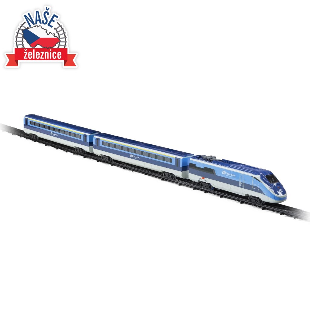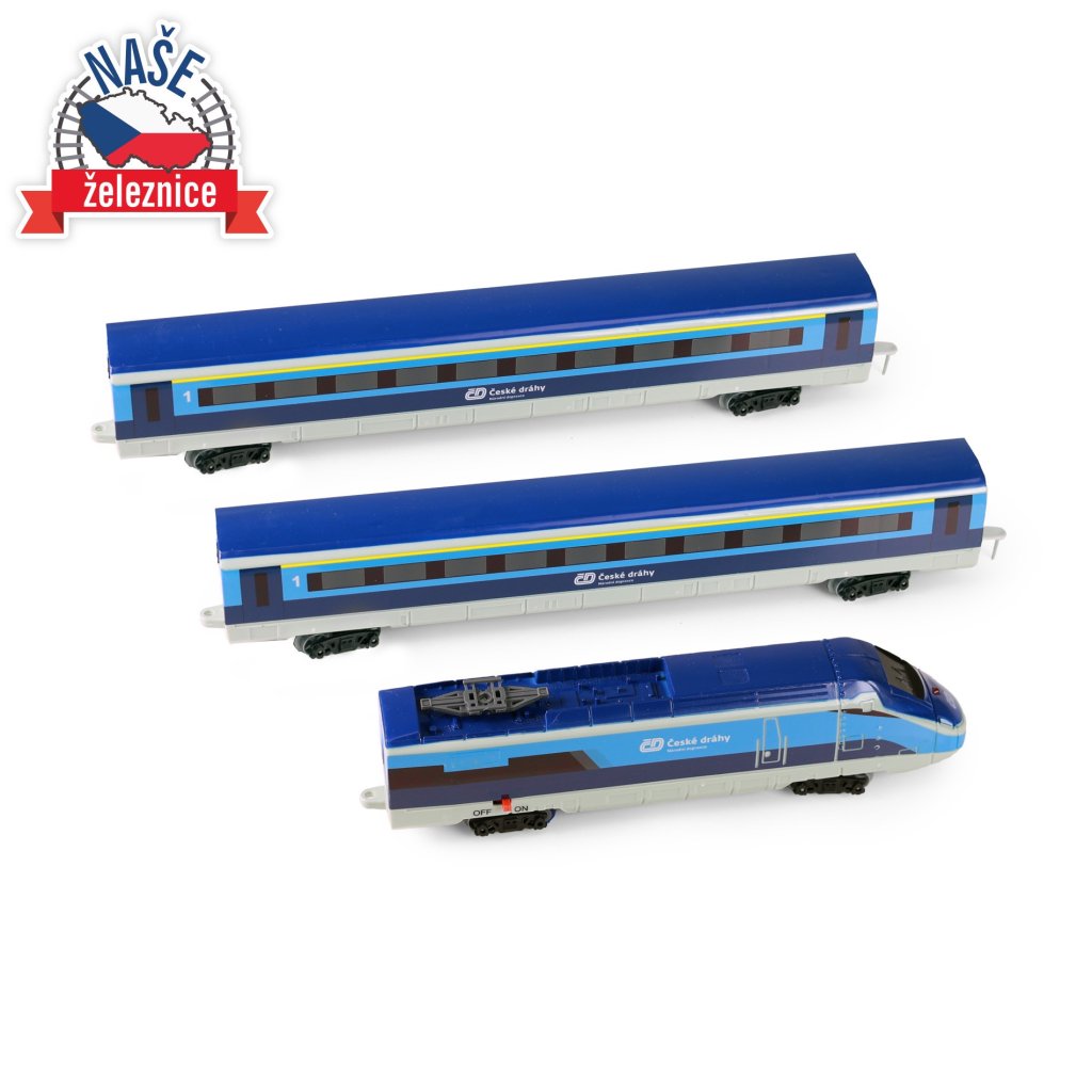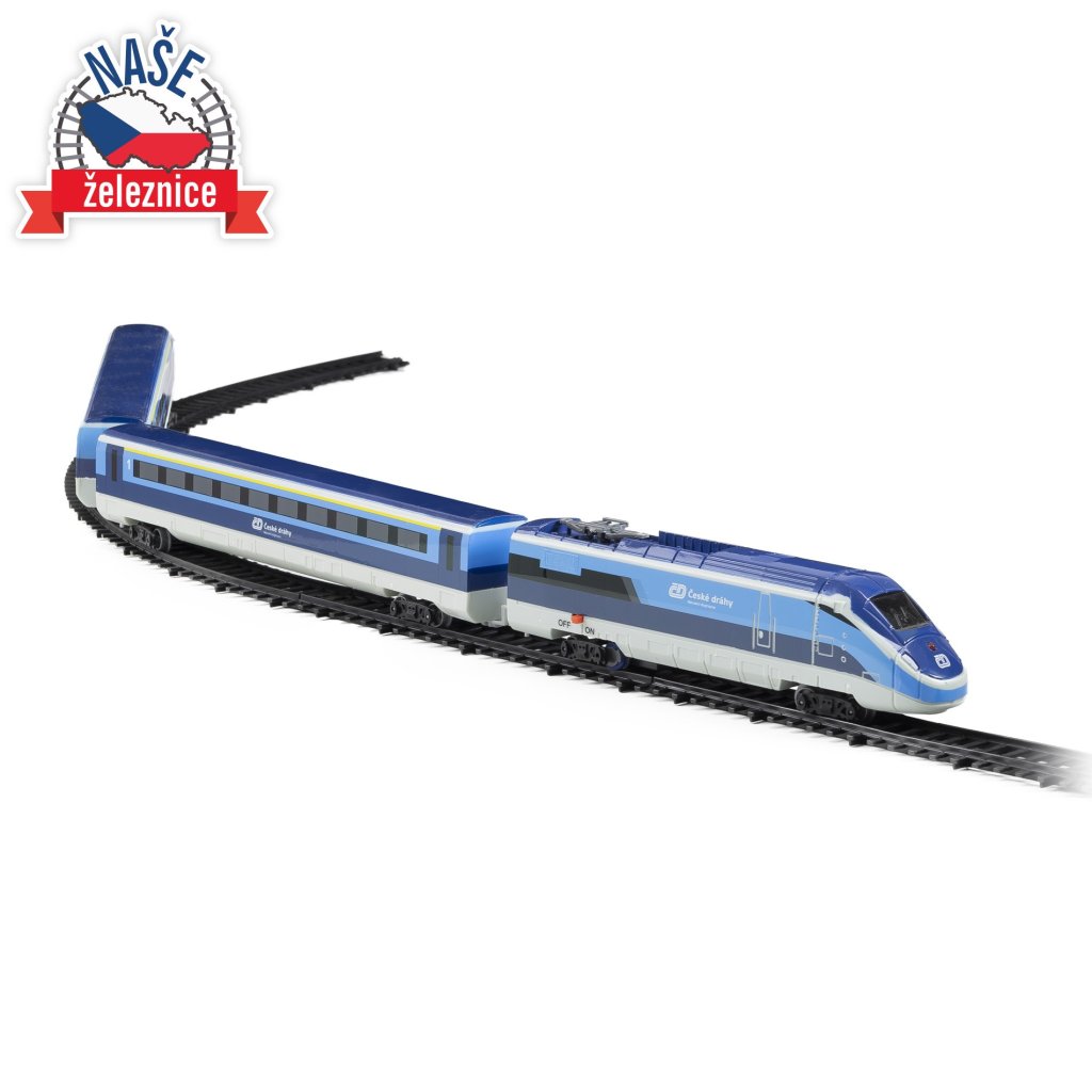 Sada z kolekcie Naša železnica obsahuje lokomotívu, dva vagóny, 12 zahnutých a 8 rovných koľají. Lokomotíva meria na dĺžku 23,5 cm a vagón 30 cm. Lokomotíva jazdí, vydáva zvuk a svieti vďaka 2 ks AA batérií (nie sú súčasťou balenia). Celková dráha koľají meria 4,8 m a ich rozstup je 2,1 cm. Veľkosť koľaje rovné je 23 cm a zahnuté 25 cm. Túto novinku možno kombinovať s vlakom RegioJet. Touto originálnou vlakovú sadou Českých dráh určite potešíte všetkých milovníkov a nadšencov železníc. Rozmer (cm)