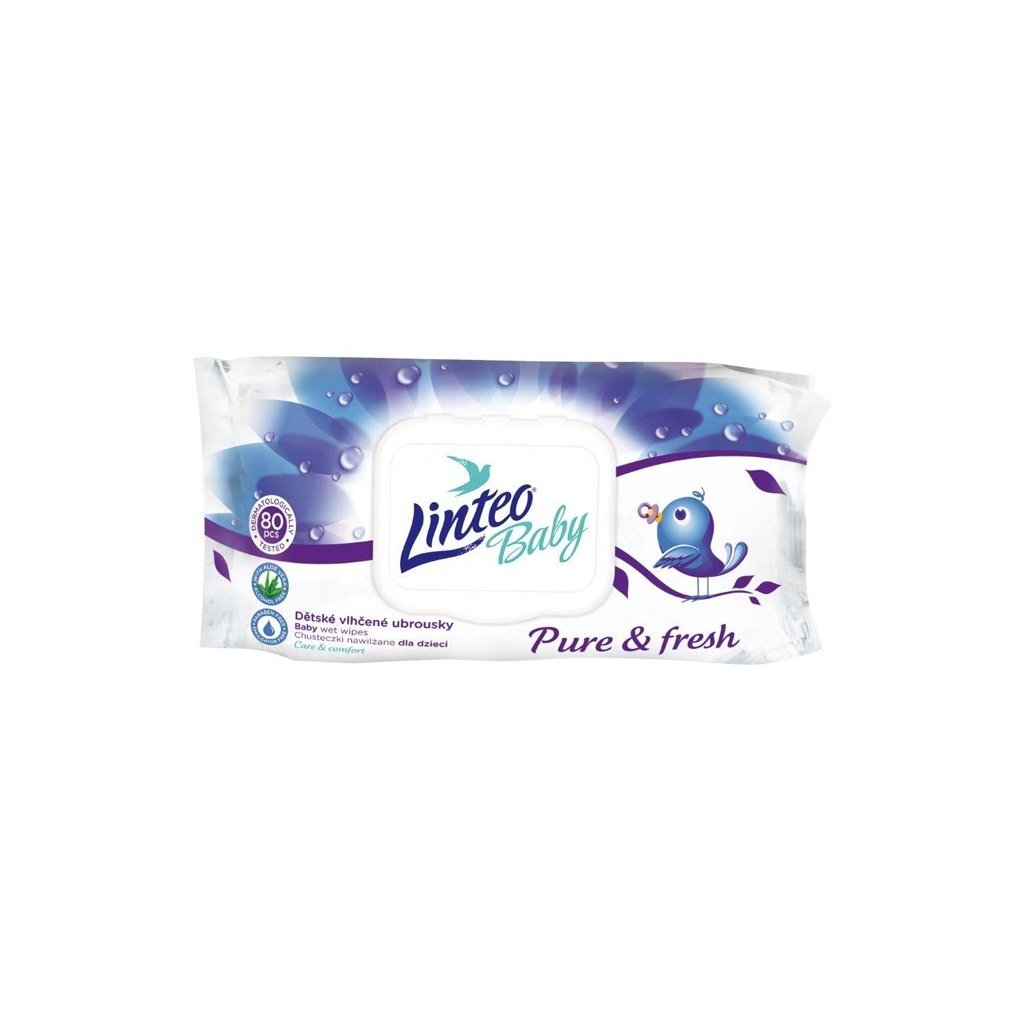 Vlhčené obrúsky Linteo Baby Pure and fresh. Čistiace obrúsky obsahujú jemné mlieko s výťažkami z aloe vera. Čistí, hydratujú, a chránia pokožku pred tvorbou zaparenín. Neobsahujú parabény a PEG emulgátory, tým znižujú riziko vzniku alergií. Udržujú prirodzené PH pokožky, bez alkoholu, dermatologicky testované. Obsah balenia 80 kusov. Veľkosť