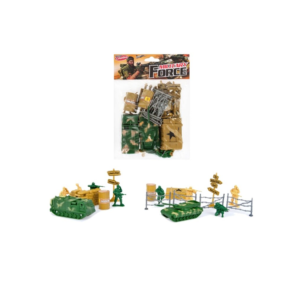 Hra s vojenskou súpravou poskytne každému dieťaťu veľa zábavy! Sada obsahuje: 2 tanky, krabicu s nábojnicami, sudy a figúrky vojakov.