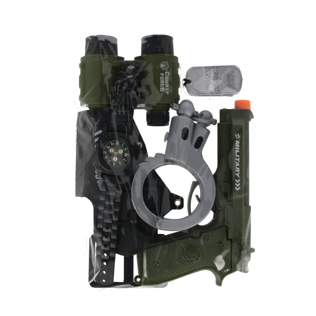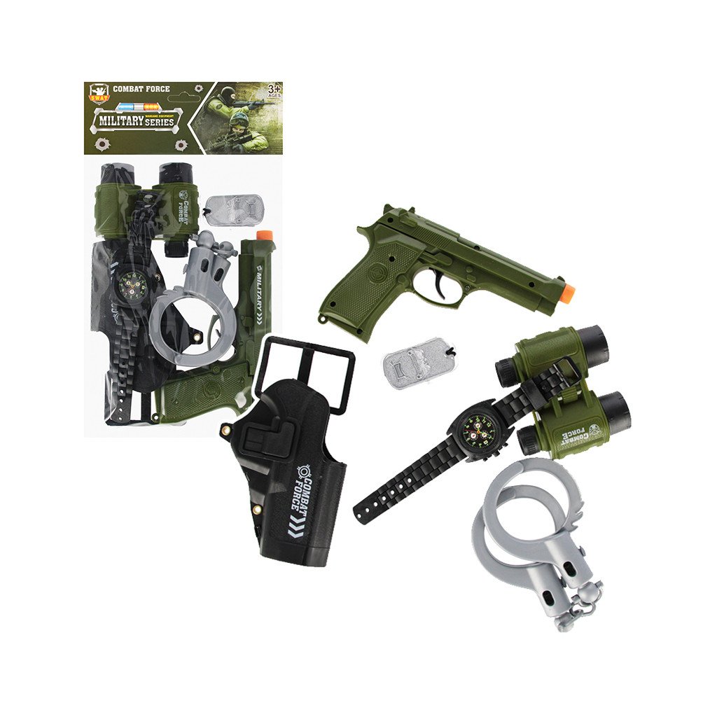 Vojenský set, má rozmery 21x30x3 cm. Sada obsahuje zbraň + puzdro, ďalekohľad, hodinky, putá, odznak. Cena je za sadu. Vhodné pre deti vo veku 3+ rokov....