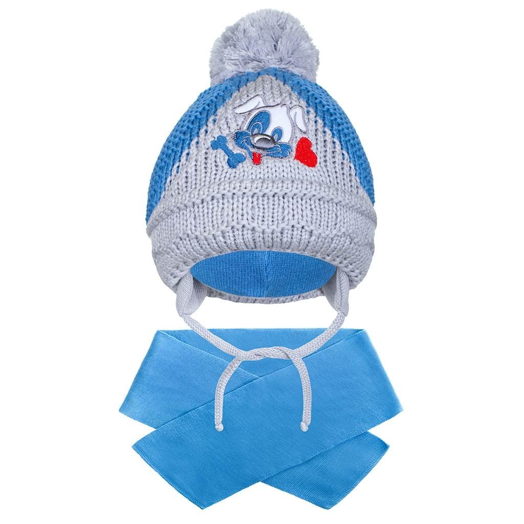 Nádherná zimná pletená čiapočka New Baby. Čiapočku zdobí krásny obrázok psíka. Má zaväzovacie šnúrky, úpletovú podšívku a roztomilý brmbolec. Zloženie 100% bavlna. Čiapočka je vhodná pre zimné dni. Ideálna pre malé i väčšie deti. Čiapka je tvarovaná tak, aby kryla ušká. Obvod okolo hlavičky 44-48 cm. Šál: rozmer: cca 96 cm. Veľkosť 104 (3-4r)